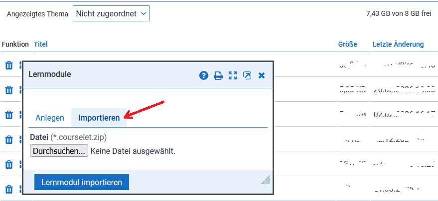 - Wechseln Sie in den Bereich Importieren (siehe Bild), suchen Sie das Modul im gespeicherten Ordner und laden Sie es in Ihren Bereich hoch